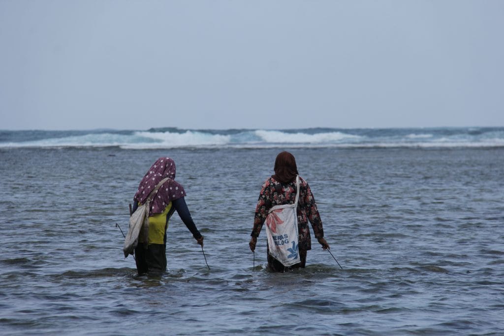 Nelayan pinggiran biasanya adalah nelayan perempuan dengan peralatan seadanya seperti kawat besi dan tempat hasil tangkapan. Kelebihan dari nelayan ini adalah kemampuan atau kejelian melihat lubang tempat gurita atau pergerakan guritanya langsung di karang. Namun sayangnya, nelayan pinggiran ini dibatasi dengan ruang pencarian yang sempit. Dimana mereka hanya bisa berburu Gurita di pinggiran laut saja dan itupun pada saat laut sedang surut dan kondisi karang yang masih bagus.
